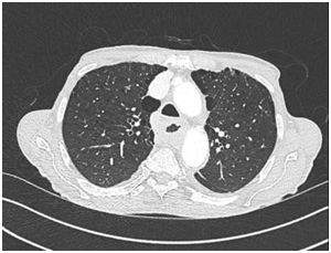Fig 1 – Computed Tomography scan of the chest, abdomen and pelvis: severe relatively concentrical thickening of most of the oesophagus, especially of the oesophageal wall over approx- imately 15.5 cm in length